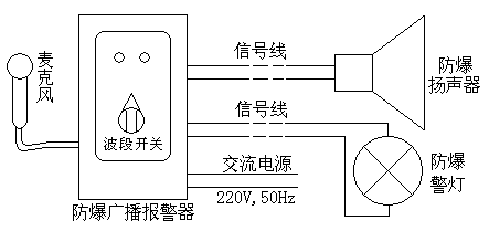 GJ—1型防爆廣播報(bào)警系統(tǒng)由HZBQ-3B型防爆廣播報(bào)警器(防爆電話機(jī))和dYH—5型防爆揚(yáng)聲器組成,也可加入防爆警燈,構(gòu)成聲和光同時(shí)報(bào)警。該防爆廣播報(bào)警系統(tǒng)把廣播呼叫和報(bào)警功能融為一體。把旋轉(zhuǎn)開關(guān)扳到廣播檔位,對著麥克風(fēng)(話筒)講話,可以通過防爆揚(yáng)聲器對現(xiàn)場進(jìn)行廣播呼叫,發(fā)布生產(chǎn)指令;把旋轉(zhuǎn)開關(guān)扳到報(bào)警檔位,可發(fā)出聲光報(bào)警信號。該防爆廣播報(bào)警系統(tǒng)有三種聲報(bào)警信號,以適應(yīng)各種不同的報(bào)警功能。該防爆廣播報(bào)警系統(tǒng)也可同各類火災(zāi)報(bào)警控制器或其它控制器配合使用,當(dāng)生產(chǎn)現(xiàn)場發(fā)生事故或火災(zāi)等緊急情況需要發(fā)出聲光報(bào)警信號時(shí),火災(zāi)報(bào)警控制器送來的開關(guān)控制信號也可啟動報(bào)警電路,由防爆揚(yáng)聲器發(fā)出警報(bào)聲,由防爆警燈發(fā)出閃爍的光報(bào)警信號。也可同手動報(bào)警開關(guān)配合使用,構(gòu)成簡單的防爆報(bào)警系統(tǒng)。